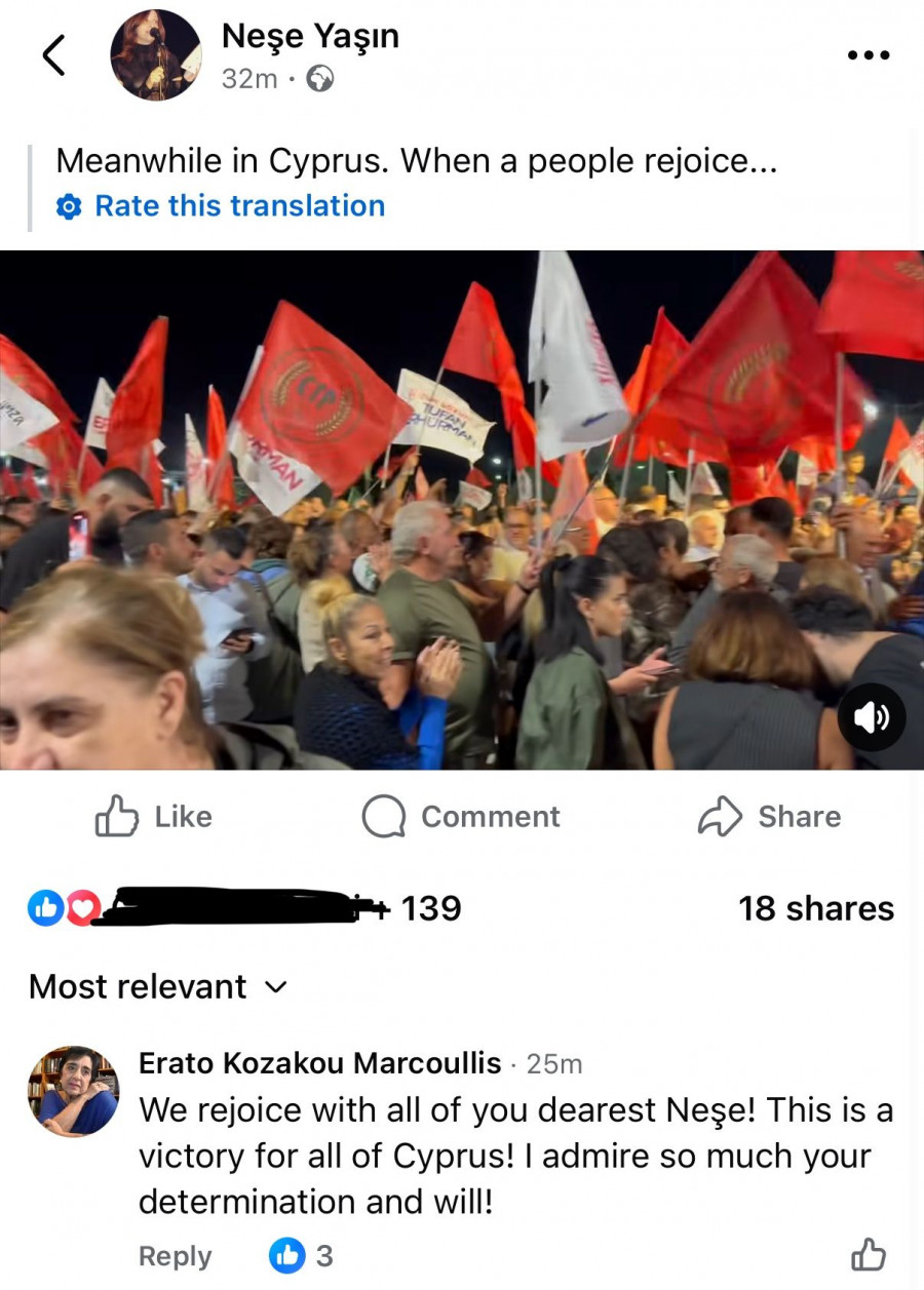 Η πρώην υπουργός Εξωτερικών, Ερατώ Κοζάκου Μαρκουλλή, χαιρέτισε δημόσια τη νίκη του Τουφάν Ερχιουρμάν στα κατεχόμενα, σχολιάζοντας ανάρτηση της Τουρκοκύπριας λογοτέχνιδας και ποίητριας, Νεσέ Γιασίν, η οποία είχε κοινοποιήσει βίντεο από τους πανηγυρισμούς του Ρεπουμπλικανικού Τουρκικού Κόμματος (CTP).