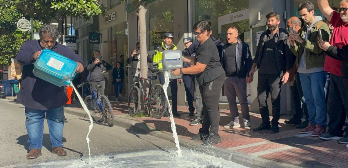 Στον δρόμο έριξαν το γάλα από τα ζώα τους κτηνοτρόφοι που συγκεντρώθηκαν έξω από το πολιτικό γραφείο του υφυπουργού Αγροτικής Ανάπτυξης και Τροφίμων, Χρήστου Κέλλα, στη Λάρισα, ζητώντας να τον συναντήσουν, για θέσουν τα αιτήματά τους.