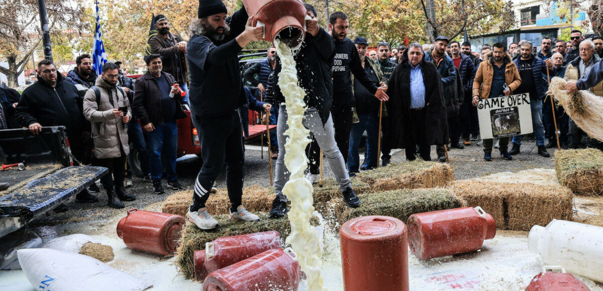 Λάρισα: Οργισμένοι κτηνοτρόφοι ρίχνουν γάλα μπροστά στο αστυνομικό μέγαρο – «Μας έχουν παρατήσει»