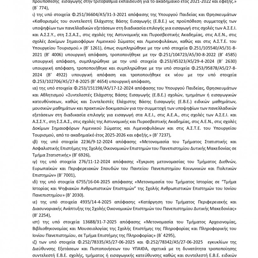 Συγκεκριμένα, ανακοινώθηκαν οι Συντελεστές Ελάχιστης Βάσης Εισαγωγής Σχολών, Τμημάτων ή Εισαγωγικών Κατευθύνσεων, καθώς και οι Συντελεστές Ελάχιστης Βάσης Εισαγωγής ειδικών μαθημάτων, μουσικών μαθημάτων και πρακτικών δοκιμασιών, τόσο αυτών που ορίστηκαν αρχικά όσο και αυτών που έχουν τροποποιηθεί κατόπιν πρότασης των Πανεπιστημιακών Ιδρυμάτων και των Συναρμόδιων Υπουργείων, για τη συμμετοχή των υποψηφίων στις Πανελλαδικές εξετάσεις έτους 2026 και εφεξής, για εισαγωγή στα ΑΕΙ, στις ΑΕΑ, στις σχολές των ΑΣΕΙ και ΑΣΣΥ, στη ΣΣΑΣ, στις σχολές της Αστυνομικής και Πυροσβεστικής Ακαδημίας, στις ΑΕΝ, στις σχολές Δοκίμων Σημαιοφόρων Λιμενικού Σώματος και Λιμενοφυλάκων και στις ΑΣΤΕ.
