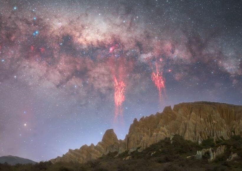 Ο Νεοζηλανδός φωτογράφος Τομ Ράε και οι Ισπανοί φωτογράφοι Νταν Ζάφρα και Χοσέ Κανταμπράνα φωτογράφιζαν τον Γαλαξία πάνω από τους βράχους Ōmārama Clay στο Νότιο Νησί της Νέας Ζηλανδίας στις 11 Οκτωβρίου, όταν έπεσαν πάνω στο εξαιρετικό γεγονός, μία σειρά από κόκκινες αστραπές στον νυχτερινό ουρανό.