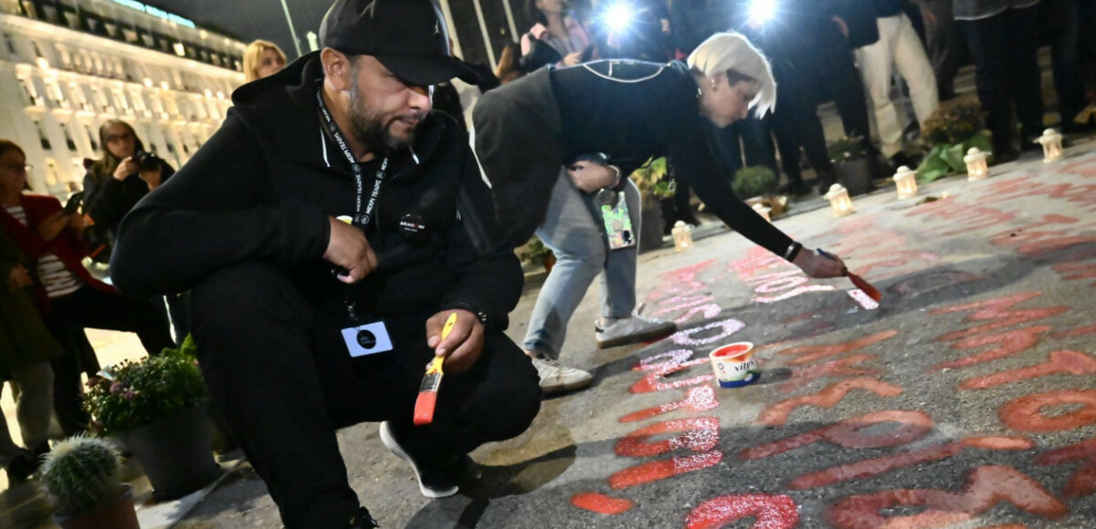 Κατά τη διάρκεια της διαμαρτυρίας, οι συγγενείς των θυμάτων έγραψαν ξανά με κόκκινη μπογιά τα ονόματα των ανθρώπων που χάθηκαν στη σιδηροδρομική τραγωδία των Τεμπών, μπροστά από το μνημείο.
